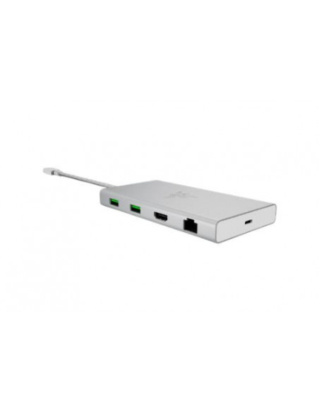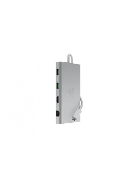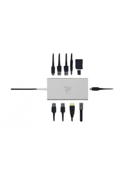A Doca USB-C Razer é uma solução de conectividade compacta e elegante em alumínio, na cor Mercury.  Permite carregar o seu dispositivo através da tecnologia USB Power Delivery (PD) com uma potência máxima de 85W.  A doca oferece uma vasta gama de opções de conectividade, incluindo uma porta USB 3.2 Gen 1 (3.1 Gen 1) Type-C, duas portas USB 3.2 Gen 2 (3.1 Gen 2) Tipo A, uma porta USB 3.2 Gen 2 (3.1 Gen 2) Tipo C, uma porta HDMI, uma porta Ethernet RJ45 (Gigabit), e um leitor de cartões SD e microSD.  Para facilitar a utilização, inclui uma entrada combo para auscultadores e microfone. O comprimento do cabo USB é de 20 cm. A doca é compatível com Windows 10, Windows 11, macOS 10.13 High Sierra, macOS 10.14 Mojave, macOS 10.15 Catalina e versões posteriores.
