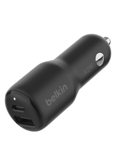 Carregador duplo para carro Belkin de 42W, com portas USB-A e USB-C, permite carregar dois dispositivos simultaneamente. Design compacto e eficiente, ideal para viagens. Cores Preto e Sable.