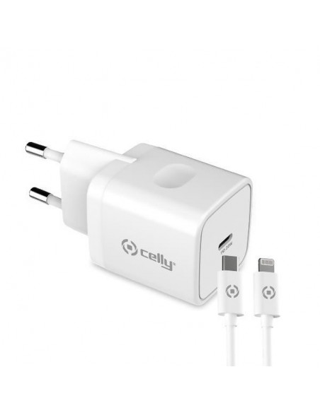 Carregador de parede Celly com saída USB-C de 20W e cabo Lightning incluído. Ideal para carregar rapidamente smartphones e outros dispositivos compatíveis. Design compacto e elegante em branco.
