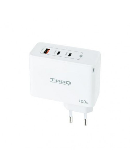 Carregador de parede Tooq com tecnologia GaN (Nitreto de Gálio), fornecendo uma carga rápida e eficiente. Com potência de 100W, oferece duas portas USB-C com Power Delivery (PD) e uma porta USB-A com Quick Charge (QC). Design compacto e branco.  Certificações CE, LVD e RoHS.