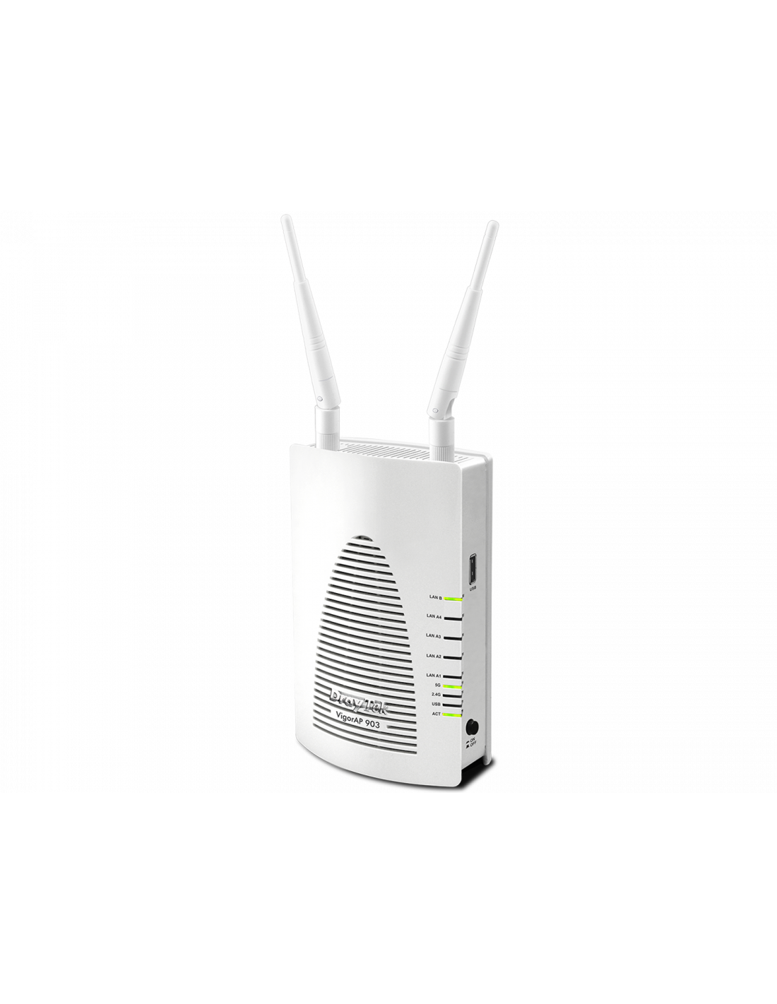 Este access point possui uma switch Gigabit de 5 portas, com uma porta que suporta Power over Ethernet (PoE), simplificando a instalação e o fornecimento de energia. A porta USB permite a conexão de um termómetro, monitorizando a temperatura do ambiente. O VigorAP 903 oferece múltiplos SSIDs e suporte VLAN, permitindo segmentar a rede para diferentes necessidades e níveis de acesso.