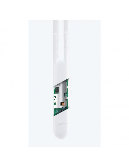 As características técnicas incluem duas antenas externas omni de dupla banda (2.4GHz e 5GHz), oferecendo cobertura e qualidade de sinal otimizadas. O UAP-AC-M possui também um único porto Ethernet Gigabit para uma conexão com fio estável. O consumo de energia máximo é de 8.5W, enquanto as dimensões compactas (353 x 46 x 34,4 mm) e o peso leve (152g) facilitam a sua integração em vários cenários. O UAP-AC-M suporta o recurso de poupança de energia, otimizando o consumo de energia.