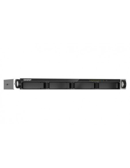 O TS-435XEU da QNAP é um NAS de 4 baias concebido para montagem em rack de pequena profundidade, oferecendo uma solução de armazenamento empresarial compacta e eficiente. A sua profundidade reduzida de apenas 292mm (11,49 polegadas) torna-o ideal para racks de menor tamanho ou espaços com muitos cabos. Este dispositivo é impulsionado por um processador quad-core Marvell® CN9130 série CN9131 ARM®v8 Cortex-A72 a 2,2 GHz com 4GB de memória DDR4 (expansível até 32GB) e suporta unidades SATA 6Gb/s. A integração de dois portas SFP+ 10GbE e duas portas RJ45 2,5GbE permite a criação de redes de alta velocidade para aplicações exigentes, como transferência de ficheiros, backup, recuperação e streaming. A tecnologia de agregação de portas e balanceamento de carga garante a otimização da largura de banda.