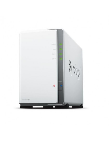 Servidor NAS Synology DS223J, compacto e eficiente, ideal para utilizadores domésticos e pequenas empresas. Oferece duas baias SATA para discos rígidos de 2,5" ou 3,5", suporte RAID e conectividade Gigabit Ethernet.