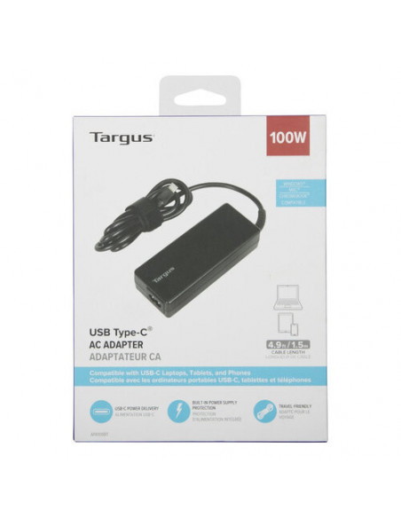 Carregador Targus USB-C com tecnologia Power Delivery (PD) de 100W.  Ideal para carregamento rápido de dispositivos USB-C.  Recomendamos visitar o site da Targus ou contactar-nos para mais informações.
