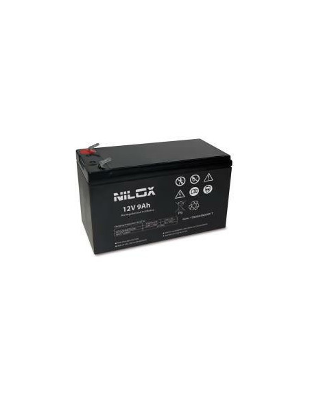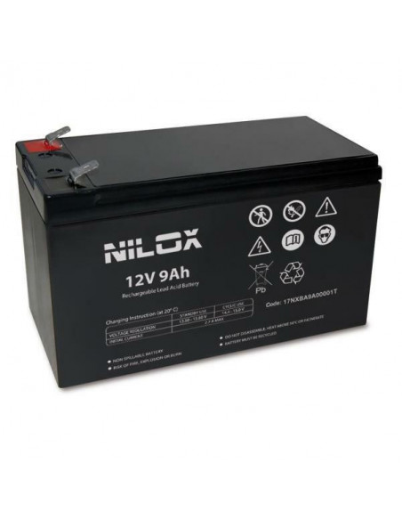 Bateria NILOX para sistemas UPS, modelo 17NXBA9A00001T.  Bateria de chumbo-ácido com 12V e 9Ah de capacidade.  Dimensões: 94x151x65mm. Peso: 2650g.