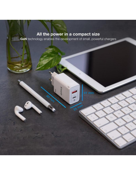 O carregador de parede Tooq GAN USB-C/PD + USB-A/QC 45W é uma solução de carregamento poderosa e compacta para os seus dispositivos eletrônicos.  Utilizando a tecnologia GaN (Nitreto de Gálio), este carregador oferece uma eficiência energética superior, permitindo um carregamento mais rápido e com menos calor gerado.  Em comparação com os carregadores tradicionais, o design compacto do carregador Tooq é uma vantagem significativa, permitindo maior portabilidade e ocupando menos espaço nas suas tomadas.
