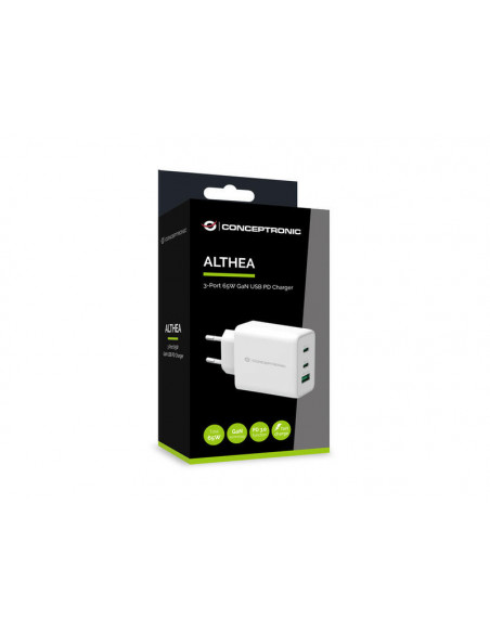 Conceptronic ALTHEA12W. Tipo de carregador: Interior, Tipo de fonte de alimentação: AC, Compatibilidade do carregador: Universal. Tensão de saída máxima: 5 V. Quantidade de portas USB Tipo-C: 2, Carregamento rápido, Características de potência de proteção: Sobreaquecimento, Sobrecarga, Curto-circuito. Cor do produto: Branco