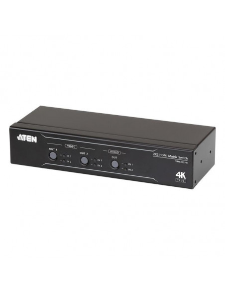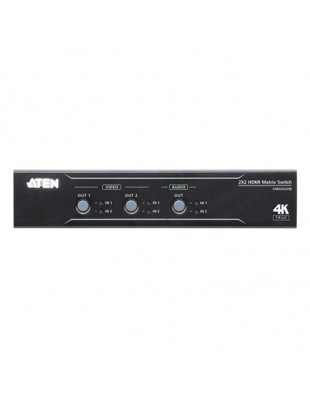 O comutador de matriz ATEN VM0202HB 2x2 permite gerir conteúdo em duas telas.  Qualquer entrada pode ser encaminhada para qualquer saída, simplificando a visualização de diferentes fontes HDMI em diferentes ecrãs. Suporta resolução True 4K (4096x2160 e 3840x2160) e inclui um extractor de áudio.
