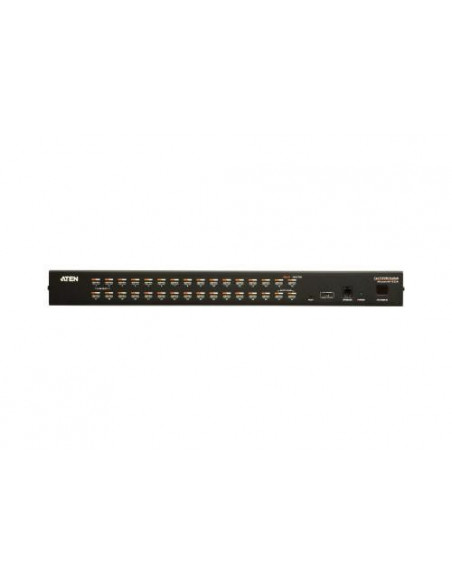 O interruptor KVM ATEN KH1532A é um dispositivo de comutação multi-interface que permite controlar até 32 computadores a partir de um único console.  Este modelo de montagem em rack oferece uma solução compacta e eficiente para a gestão de múltiplos sistemas. O console utiliza interfaces USB e PS/2 para teclado e rato, bem como VGA para vídeo. A resolução máxima suportada é de 1920 x 1200 pixéis, com um intervalo de escaneamento de 1,255 segundos.