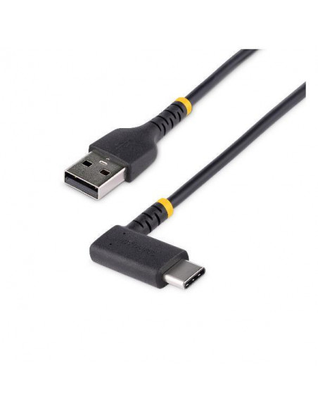 Cabo USB-A para USB-C Startech de alta durabilidade, com 2 metros de comprimento e conector USB-C em ângulo reto. Ideal para carregar e transferir dados para dispositivos USB-C, incluindo iPhones a partir do modelo 15.  Este cabo robusto é reforçado com fibra de aramida, protegendo-o contra dobras e torções frequentes.  Suporta até 3A para carregamento rápido e eficiente.