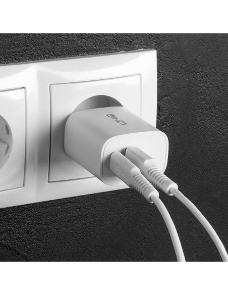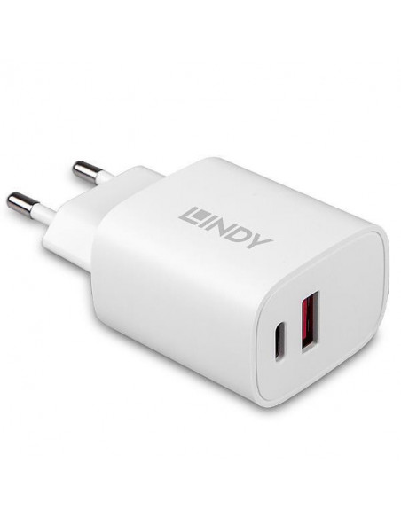 Carregador de parede Lindy de 20W com conectores USB Tipo A e Tipo C para carregar smartphones, tablets e outros dispositivos.  Potência de 20W para carregamento rápido e eficiente. Design compacto e cor branca elegante.