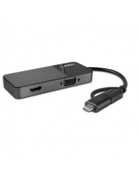 Adaptador Lindy que converte USB 3.0 Tipo A e Tipo C para HDMI e VGA. Permite ligar dispositivos USB a monitores ou projetores com entrada HDMI ou VGA.