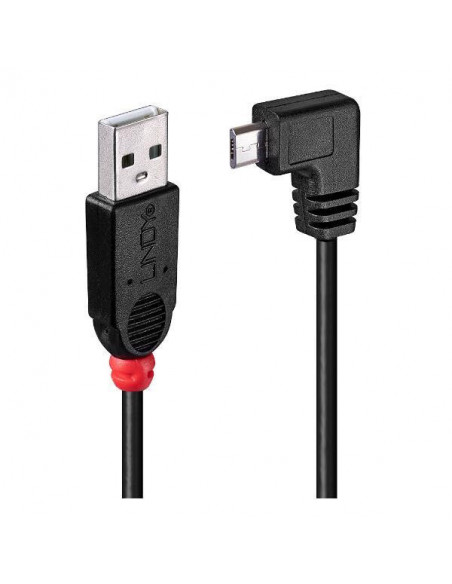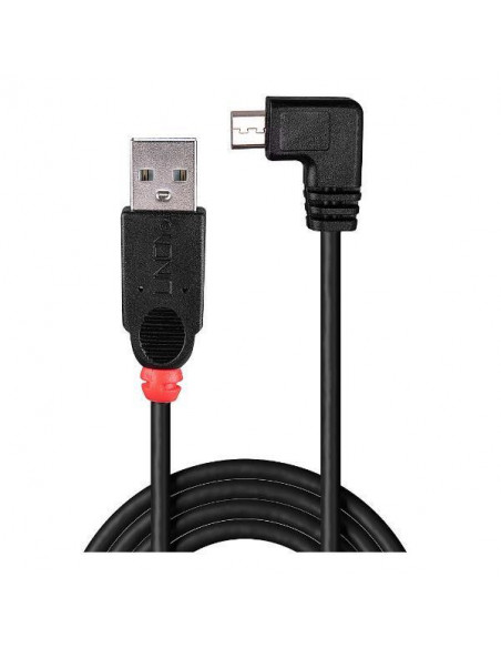 O cabo USB 2.0 Lindy 31975, com 0,5 metros de comprimento e conector em ângulo reto de 90 graus, conecta portas USB Tipo A a Micro-B. Ideal para espaços reduzidos, garante transferência eficiente de dados e energia.  Construção robusta e compatibilidade com diversos dispositivos.