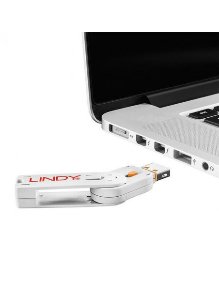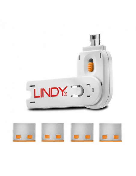 Kit com 4 bloqueadores de porta USB tipo A da Lindy, com sistema de cadeado e chave.  Construídos em aço resistente, impedem o acesso não autorizado às portas USB.  Ideal para ambientes corporativos, escolas ou domésticos. Garantia de 36 meses.