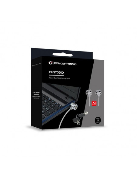 Cadeado de segurança Conceptronic para portátil com cabo de aço de 1,5m e dupla chave. Protege o seu portátil contra roubos, prendendo-o a uma superfície fixa.