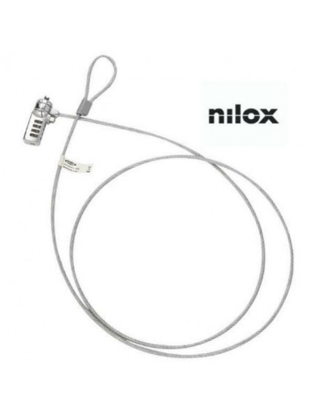 Cabo de segurança Nilox NXSC002, com código EAN 8435099528883, ideal para proteger um dispositivo portátil. Possui um comprimento de 180 cm e diâmetro de 4 mm, na cor cinzenta. Sistema de bloqueio com cadeado de código.