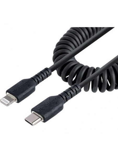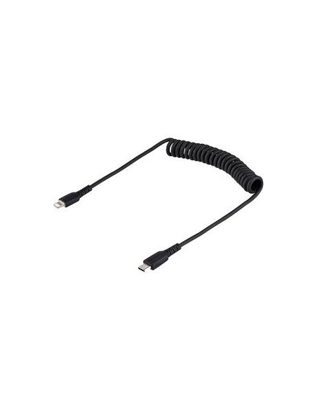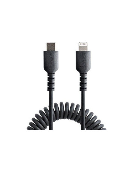 Cabo USB-C para Lightning StarTech de 50cm, com design enrolado para evitar nós e fácil arrumação. Certificado MFi para carregamento e sincronização rápidos e confiáveis em dispositivos Apple. Construção reforçada com fibra de aramida para maior durabilidade. Ideal para iPhone, iPad, AirPods e outros dispositivos Lightning.
