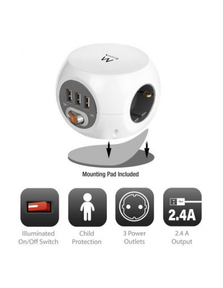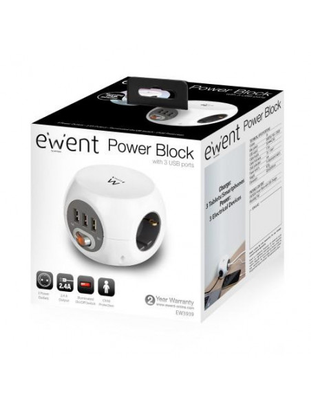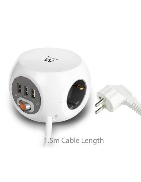 A extensão elétrica Ewent EW3939 é uma solução compacta e prática para conectar múltiplos dispositivos.  Com três tomadas AC e três portas USB (2,4A no total), permite ligar até seis dispositivos simultaneamente.  Inclui proteção contra sobrecargas, curto-circuitos e proteção infantil nas tomadas.  O interruptor de ligar/desligar com iluminação permite controlar toda a energia de uma só vez. O cabo tem 1,5m de comprimento e é branca.