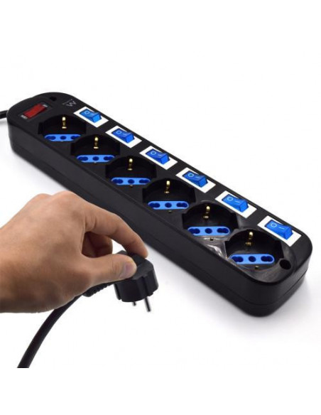 A régua de tomadas de alimentação Ewent EW3851 oferece uma solução prática e segura para conectar e gerir vários dispositivos elétricos. Com 6 tomadas de corrente, cada uma com um interruptor individual e luz indicadora, permite controlar o consumo de energia de cada dispositivo individualmente, minimizando o consumo em stand-by.  A proteção infantil nas tomadas assegura a segurança das crianças.