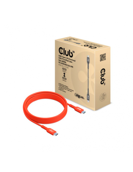 Este cabo CLUB3D CAC-1573 é um cabo USB Tipo-C para USB Tipo-C, com 2 metros de comprimento e certificado pela USB-IF (USB Implementers Forum), garantindo compatibilidade e desempenho otimizados.  A sua construção robusta, utilizando material EPR (Ethylene Propylene Rubber), assegura durabilidade e resistência à flexão. O cabo suporta transferência de dados a uma velocidade máxima de 480 Mbps e Power Delivery (PD) com potência de até 240W (48V/5A), ideal para carregar dispositivos de alta potência, como notebooks e tablets. A sua cor laranja o destaca e facilita a identificação.  O cabo possui conectores USB Tipo-C macho em ambas as extremidades (M/M).  Cumpre as normas RoHS (Restriction of Hazardous Substances) e possui certificações CE e FCC, demonstrando a sua conformidade com as normas de segurança e qualidade. Peso: 64g.