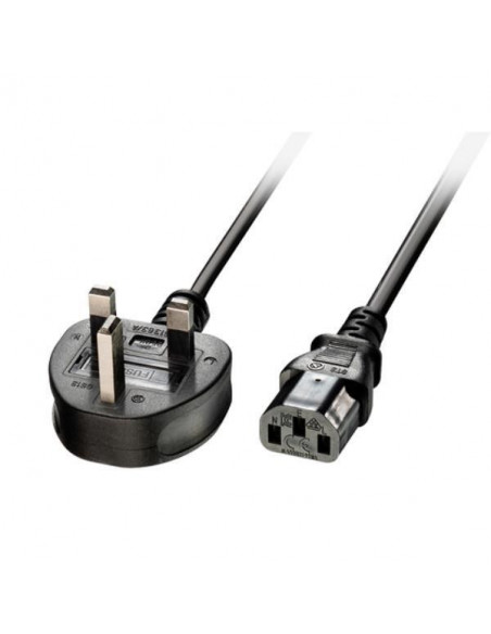Cabo de alimentação Lindy com plugue de 3 pinos do Reino Unido e conector IEC C13 fêmea. Ideal para alimentar computadores, monitores e outros dispositivos eletrónicos. Comprimento de 2 metros. Construção robusta e segura. Garantia de 24 meses.