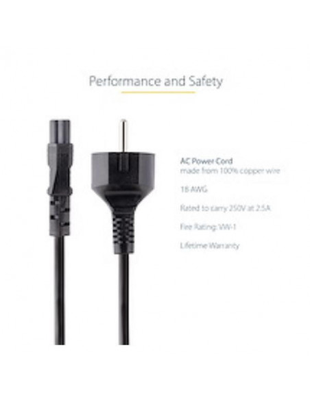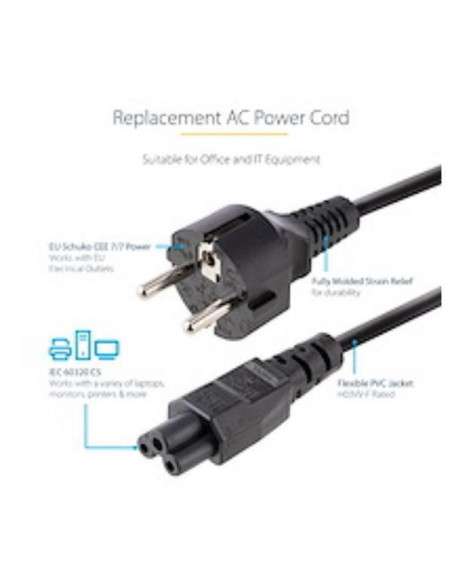 Este cabo de alimentação StarTech de 3 metros (10 pés) oferece uma solução confiável para alimentar computadores portáteis. Ele apresenta uma ficha Schuko CEE 7/7 (padrão europeu) em uma extremidade e um conector IEC 60320 C5 de 3 pinos na outra. Este cabo é uma excelente opção de substituição para computadores portáteis HP, Toshiba e outros modelos compatíveis equipados com uma fonte de alimentação com conector C5. Construído com materiais de alta qualidade, garante uma conexão segura e eficiente, suportando uma corrente de 2.5A e voltagem de 250V. A sua construção robusta e os conectores reforçados garantem durabilidade e confiabilidade. A StarTech oferece garantia vitalícia, incluindo suporte técnico multilíngue 24/5 gratuito.
