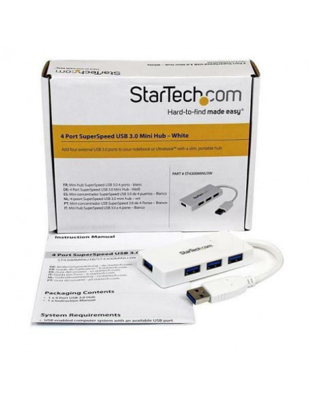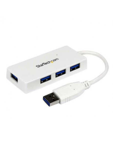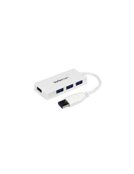 O Hub USB 3.0 SuperSpeed de 4 portas StarTech.com (modelo ST4300MINU3W) é a solução ideal para expandir a sua conectividade USB.  Este hub compacto e elegante, na cor branca, transforma uma única porta USB 3.0 num conjunto de quatro portas externas, proporcionando flexibilidade e conveniência para conectar múltiplos dispositivos. O seu design de cabo integrado elimina a necessidade de cabos adicionais, mantendo a sua área de trabalho organizada e livre de emaranhados.