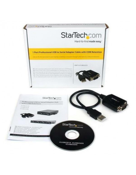 Adaptador profissional StarTech ICUSB2321X que converte USB 2.0 para serial RS232. Retenção da porta COM. Ideal para conectar dispositivos seriais a computadores modernos. Cabo de 30cm. Garantia de 2 anos.