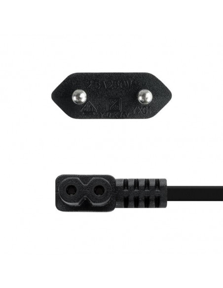 O cabo de alimentação Nanocable angulado é uma solução prática e segura para alimentar os seus dispositivos eletrónicos. Com 1,8 metros de comprimento e conectores angulados a 90°, é ideal para situações em que o espaço é reduzido. Este cabo permite uma conexão eficiente e discreta. O conector CEE 7/16 macho é compatível com a maioria das tomadas de parede, enquanto o conector C7 fêmea se adapta a vários dispositivos eletrônicos, tais como televisores, carregadores de portáteis, etc. Fabricado com 100% de cobre AWG18, este cabo de alimentação suporta uma potência máxima de 1500W (250V/2,5A), garantindo uma alimentação estável e segura para os seus equipamentos. A cor preta confere um visual discreto e elegante.  Cumpre com as normas RoHS, sendo uma escolha sustentável e ecologicamente correta.  Cada cabo é testado individualmente para garantir um funcionamento perfeito.