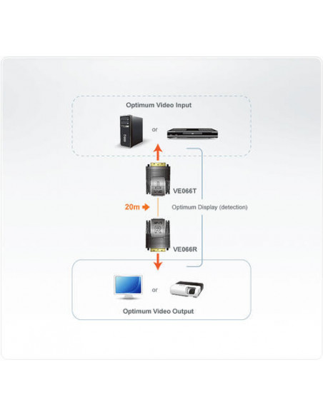 Características\n- Alarga la distancia entre la fuente DVI y el dispositivo de visualización DVI\n- Requiere un cable de Cat. 5e para conectar las unidades transmisora y receptora\n- Transmisión a larga distancia: hasta 20 m*\n- Compatible HDCP 1.1\n- Admite la conexión/desconexión en caliente\n- Calidad gráfica superior - hasta 1920x1200\n- Carcasa compacta\n- Compatible con todos los conmutadores DVI y repartidores DVI de ATEN\n- Admite pantallas LCD, televisores plasma y proyectores\n- Ideal para sistemas de entretenimiento en casa, aplicaciones de banca, sistemas de vigilancia, pantallas multimedia al exterior, aeropuertos, instituciones financieras\n- Visualización de imagen inteligente – la imagen se optimiza en función de la máxima resolución disponible en el dispositivo de visualización\n- No requiere alimentación externa\n\nContenido del Embalaje\n- 1 VE066T extensión DVI Mini para cables de Cat. 5 (transmisor)\n- 1 VE066R extensión DVI Mini para cables de Cat. 5 (receptor)\n- 1 manual del usuario