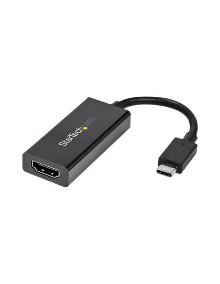 Descrição do produto: StarTech.com USB 3.1 Type C to HDMI Adapter with HDR - 4K 60Hz - TB3 Compatible - Windows & Mac Compatible Black USB C to HDMI Monitor Converter (CDP2HD4K60H) - adaptador de vídeo externo - MegaChips MCDP2900 - preto;  Tipo de dispositivo: Adaptador de vídeo externo;  Tipo de Bus: USB-C;  Motor Gráfico: MegaChips MCDP2900;  Resolução máxima: 4096 x 2160;  Detalhes das Interfaces: HDMI (conector fêmea);  Dimensões (LxPxA): 2.86 cm 1.14 cm;  Comprimento: 5.6 cm;  Cor de compartimento: Preto;  Garantia do fabricante: Garantia de 3 anos;  Projetado para: P/N:ST121HD20FXA, TB4CDOCK;