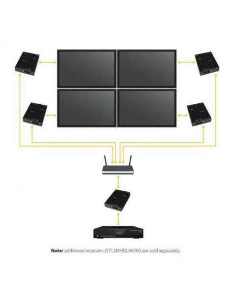 Utilizando um switch Ethernet Gigabit gerenciado (com IGMP), é possível conectar até 100 telas numa rede local (LAN). Para maior escalabilidade, até 16 unidades transmissoras ST12MHDLAN podem ser adicionadas a uma única rede (requer um switch de rede gerenciado/IGMP) com um total de até 100 telas. Cada receptor ST12MHDLANRX inclui hardware de montagem opcional para uma instalação organizada e profissional. A utilização de cabo Ethernet Cat5/Cat6 padrão com conectores RJ45 evita o incômodo de utilizar cabos especiais, contribuindo para a redução de custos e simplificação da instalação.