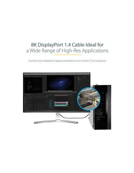 O cabo DisplayPort 1.4 da StarTech, com modelo DP14VMM2M, é uma solução de alta performance para conectar monitores, televisores e outras telas compatíveis a dispositivos com saída DisplayPort. Com um comprimento de 2 metros, este cabo certificado VESA garante uma transmissão de sinal confiável e sem perdas. Suporta resoluções de até 8K a 60Hz e HDR10, proporcionando imagens nítidas e cores vibrantes.  A sua construção robusta, com conectores banhados a ouro, garante uma excelente condutividade e durabilidade.  O cabo é blindado para reduzir interferências eletromagnéticas, assegurando uma transmissão estável e sem problemas.  Compatível com uma variedade de placas gráficas, incluindo Radeon Vega Frontier/Pro WX Series e Nvidia Quadro, bem como computadores portáteis e estações de trabalho de alta performance de marcas como Dell e HP.  Para mais detalhes técnicos, visite o site do fabricante: [http://www.startech.com](http://www.startech.com).  O cabo também oferece suporte para tecnologias como HBR3, 4:4:4 Submuestreo de croma, DSC 1.2, e HDCP 2.2, garantindo uma experiência de visualização de alta qualidade. Foi testado para resistir a mais de 5000 inserções e mais de 300 ciclos de dobragem a 120 graus.  A sua construção com TPE (Elastómero Termoplástico) não tóxico e certificado RoHS, adiciona à sua sustentabilidade ambiental. Detalhes adicionais sobre as suas características:  * Cabo DisplayPort 1.4 de alto desempenho. * Certificado pela VESA. * Suporte para 8K a 60Hz e 4K a 120Hz. * Tecnologia HDR10. * Taxa de transferência de dados de 32,4 Gbps. * Conectores banhados a ouro. * Blindagem EMI com Al-Mylar e trançado. * Cabo de 34 AWG. * Construção robusta e durável. * Compatível com várias placas gráficas e dispositivos. * Garantia vitalícia.
