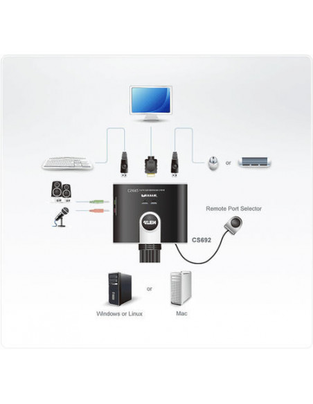 Características\n\n- Una consola gráfica HD controla dos computadoras o dispositivos con pantalla HD\n- HDMI compatible; HDCP compatible\n- Selección del ordenador deseado a través del selector de puertos remotos, teclas de acceso directo y ratón USB\n- Admite la transmisión del sonido - respuesta de graves integral con un sonido excepcional en los sistemas Surround 2.1\n- Selección independiente del control KVM y audio - un ordenador puede tener el control KVM mientras el otro tiene el control de audio*\n- Compatibilidad multiplataforma - Windows, Mac, Linux\n- Diseño compacto, todos los cables han sido incorporados en un solo cable (2 x 1,2 m)\n- Calidad gráfica superior – resoluciones hasta 1920 x 1200; 1080p\n- Compatible con los monitores LCD de pantalla ancha\n- Video DynaSync™ - esta tecnología exclusiva de ATEN elimina los problemas que pueden surgir con las pantallas al iniciar los equipos y optimiza la resolución a la hora de conmutar los puertos\n- Función de detección de dispositivos encendidos - en el momento que uno de los ordenadores conectados se apague, el CS692 automáticamente pasará al otro ordenador\n- Funciona con los teclados para juegos y multimedia\n- Admite teclados y ratones inalámbricos y multifunción\n- La función de omisión/emulación del puerto de consola para ratón admite la mayoría de los controladores de ratón y los ratones multifunción\n- Admite y emula teclados Macintosh**\n- Puede conectar un concentrador USB al puerto USB 2.0 para ratón para compartir dispositivos USB***\n- No requiere alimentación externa\n- Firmware actualizable\n\n* La salida del sonido por los altavoces incorporados del monitor HD no se puede conmutar de forma independiente.\n** Combinaciones de teclado para PC que emulan teclados Macintosh. Los teclados Macintosh solamente funcionan con sus ordenadores nativos.\n*** Es posible que se requiera un adaptador de alimentación adicional.Para poder utilizar el puerto USB 2.0 para ratón como concentrador USB, tendrá que desactivar el modo de emulación del ratón.\n\nContenido del Embalaje\n\n- 1 conmutador KVM de 2 puertos con cable USB, transmisión audiovisual HD y selector de puertos independiente CS692\n- 1x Guía de Usuario\n- 2 etiquetas de teclas de acceso directo