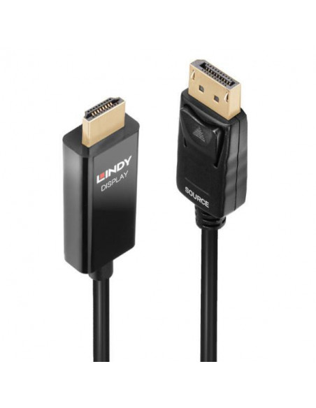 Cabo ativo Lindy DisplayPort para HDMI de 1 metro, com suporte HDR para imagens de alta qualidade. Conectores macho em ambas as extremidades. Design discreto e preto. Garantia de 24 meses.