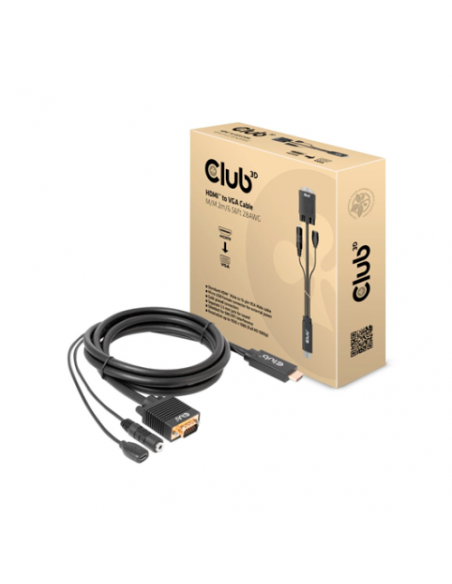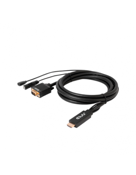 Cabo HDMI para VGA da CLUB3D, com comprimento de 2 metros e resolução máxima de 1080p.  Este cabo macho/macho oferece uma ligação fiável entre dispositivos HDMI e VGA. É compatível com RoHS e possui certificações FCC, RoHS e CE EMI.  Ideal para conectar computadores, consolas ou outros dispositivos com saída HDMI a monitores ou projetores com entrada VGA.