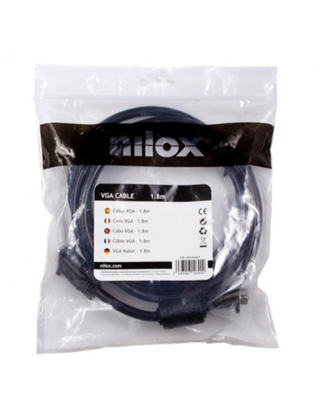 Cabo VGA NILOX de 1,8 metros com conectores macho em ambas as extremidades. Garante uma conexão segura e transmissão de sinal de vídeo com clareza. Construção robusta e revestimento preto para maior durabilidade. Ideal para uso doméstico ou profissional.