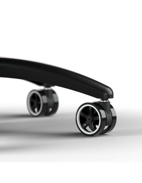 A estrutura robusta em aço garante a estabilidade e a durabilidade da cadeira, suportando até 121kg de peso. A base de cinco rodas de 7,5cm de diâmetro permite uma fácil movimentação e rotação suave. O mecanismo de elevação pneumática permite ajustar a altura do assento em 12cm, adequando-se a diferentes alturas de mesa. Para maior conforto, inclui ainda um apoio de cabeça integrado, completando o design ergonómico da cadeira.