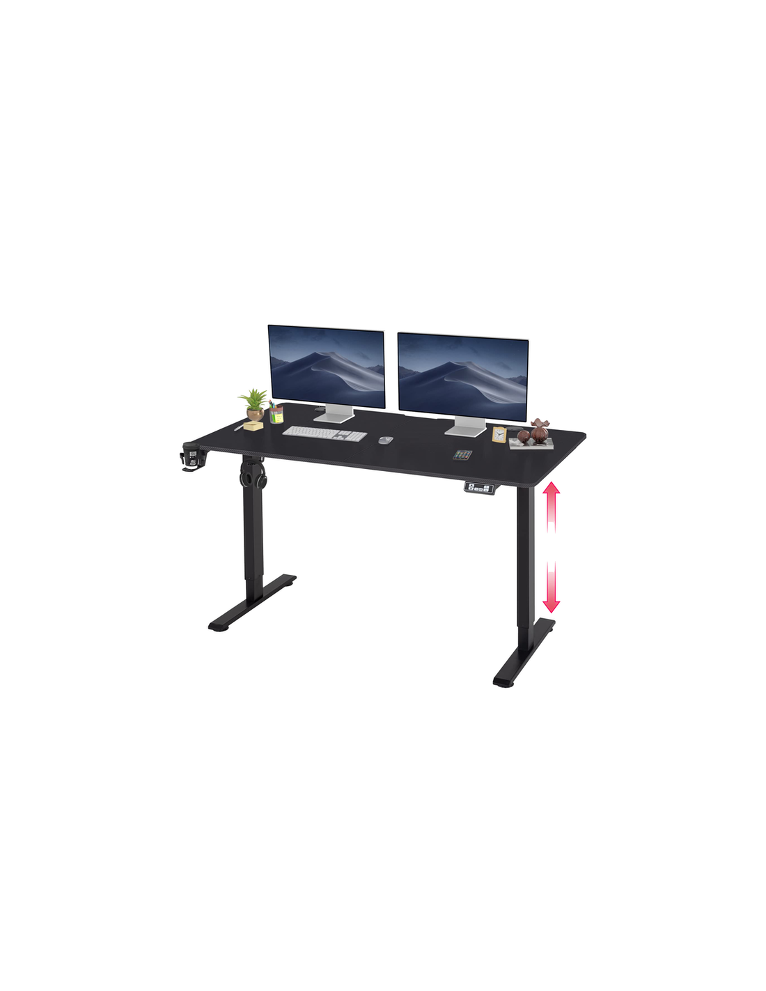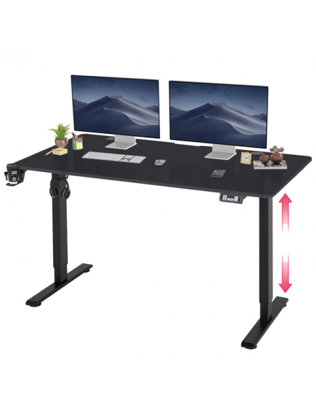 O tampo de duas peças mede 140x60 cm, oferecendo amplo espaço para acomodar dois monitores e outros equipamentos essenciais. O material P2PB Carbon com 15mm de espessura garante durabilidade e resistência a riscos e desgaste diário. A estrutura em aço carbono laminado a frio garante estabilidade mesmo com equipamentos pesados. O design incorpora características adicionais convenientes como porta-copos e porta-auscultadores, mantendo a sua mesa organizada. Um sistema de gestão de cabos ajuda a manter os fios arrumados e fora de vista.