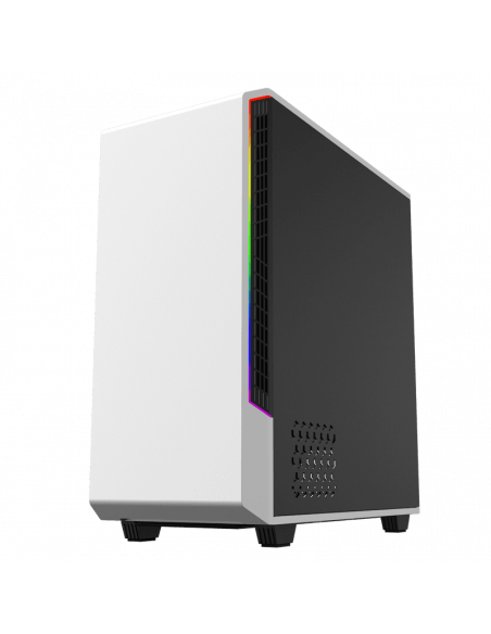 A Caixa Gamemax Panda T802 White é uma caixa Mid-Tower ATX com um design simples e elegante, perfeita para quem procura um setup gaming com um visual clean e moderno. O seu exterior branco, com o interior em preto, confere um visual harmonioso e sofisticado. O painel lateral em vidro temperado permite visualizar os componentes internos e a iluminação ARGB, criando um ambiente visualmente apelativo.