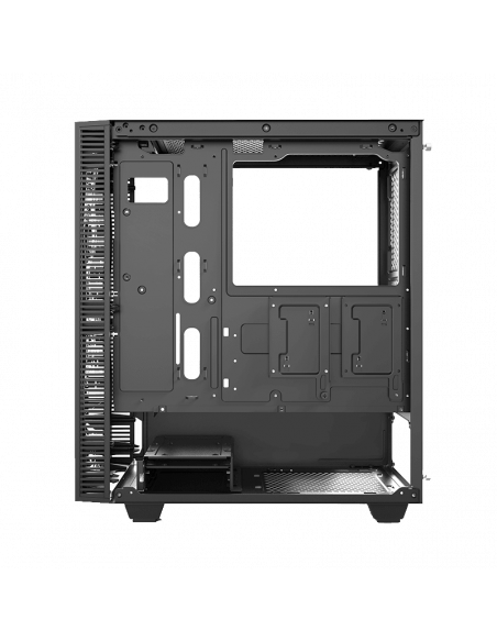 ... A caixa é de boa qualidade e facilita o acesso ao interior e troca de componentes. Não é exageradamente grande, mas é larga, o que é uma mais-valia em termos de circulação de ar e arrumação. Vem muito bem equipada no que diz respeito a ventoinhas (várias, eficientes e silenciosas) e fonte de alimentação. O painel lateral transparente é de remoção fácil através de quatro parafusos. Há vários detalhs demonstrativos da qualidade, como as anilhas em borracha entre os parafusos e o painel (antivibrações) e boleados nas superfícies metálicas para evitar cortes acidentais dos dedos quando estamos a mexer nas "entranhas" do PC. Há um espaço de arrumação específico para a fonte de alimentação, onde é possível esconder boa parte dos cabos."