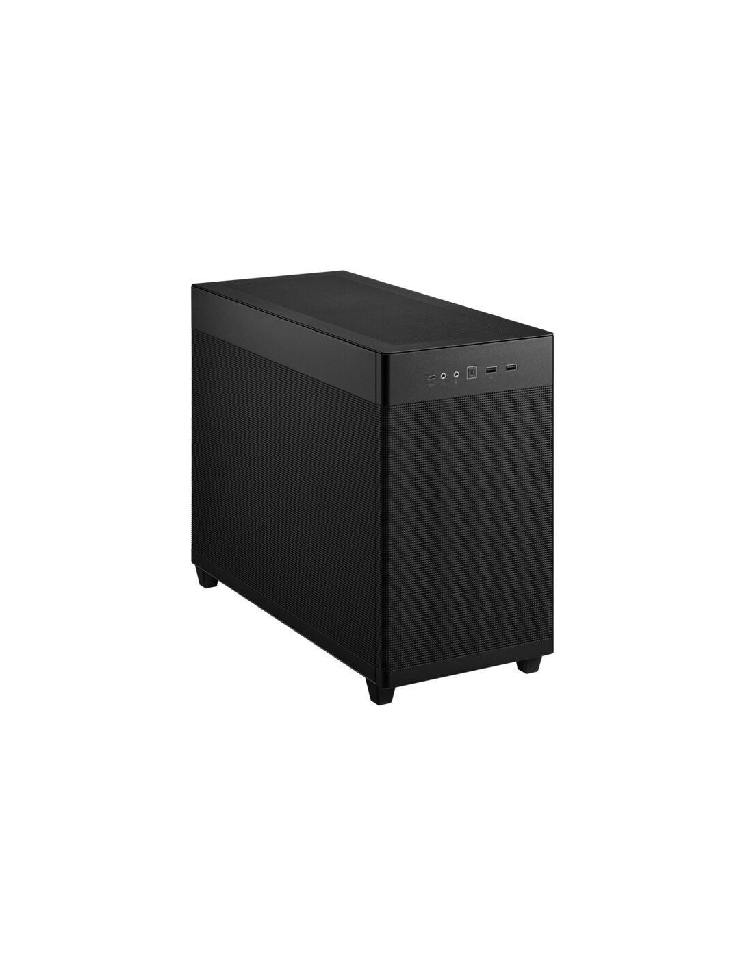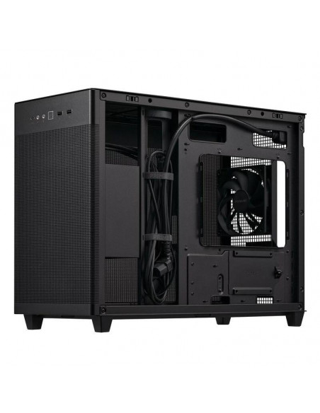 A caixa ASUS Prime AP201 é uma mini-torre negra, ideal para sistemas micro ATX e Mini-ITX. Oferece espaço para múltiplos discos rígidos e ventiladores, além de uma gestão de cabos eficiente e um painel lateral em vidro temperado. A conectividade é assegurada através de portas USB 3.2 e USB Type-C na parte frontal.