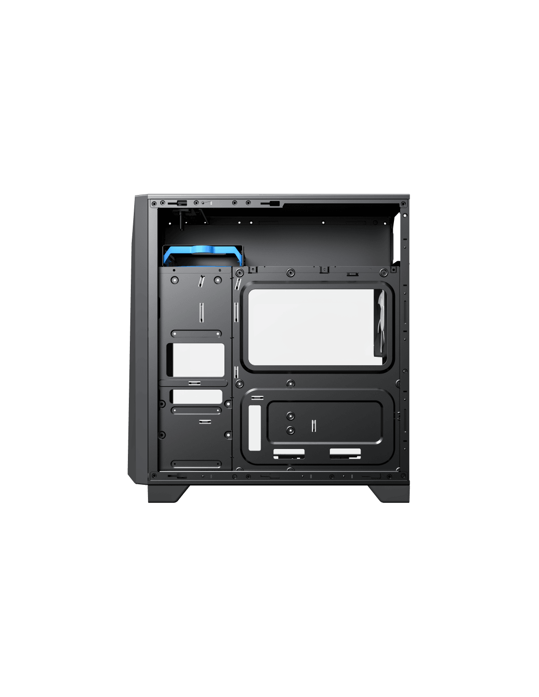 O compartimento separado para a fonte de alimentação melhora a organização interna dos cabos e otimiza o fluxo de ar, contribuindo para a refrigeração eficaz dos componentes. A caixa suporta motherboards ATX, Micro-ATX e ITX, oferecendo flexibilidade para diversas configurações. Suporta ainda instalação de water cooling na parte frontal (até 240mm) e traseira (120mm).