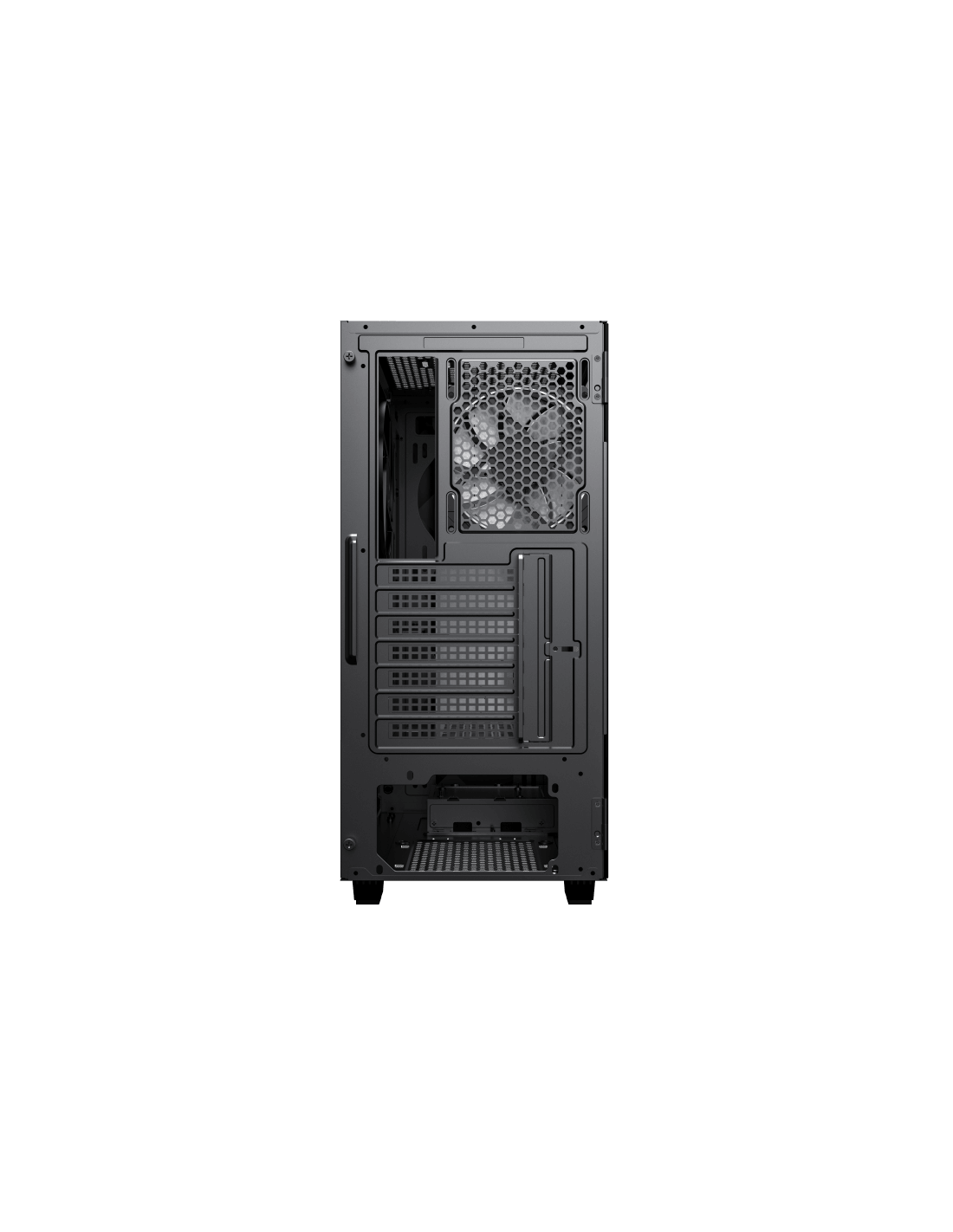 O painel frontal em ABS e o painel superior em metal garantem um design robusto e elegante. Na parte frontal, a caixa suporta até três ventoinhas de 120mm (opcionais), otimizando o fluxo de ar para um arrefecimento eficaz. No topo, é possível instalar duas ventoinhas de 120mm ou 140mm (opcionais), maximizando as opções de refrigeração. A ventoinha traseira de 120mm aRGB incluída adiciona um toque estético e contribui para a dissipação do calor.
