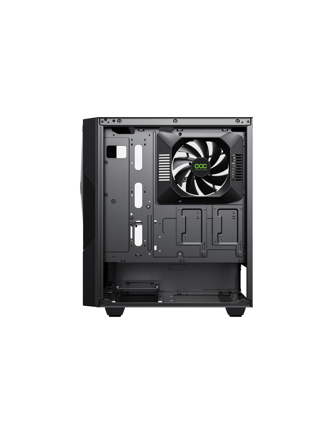 Internamente, a caixa oferece espaço para duas baias de 3.5 polegadas e duas baias de 2.5 polegadas, além de sete slots de expansão. A caixa suporta placas gráficas com até 340mm de comprimento e coolers de CPU com até 170mm de altura, acomodando componentes de alto desempenho.