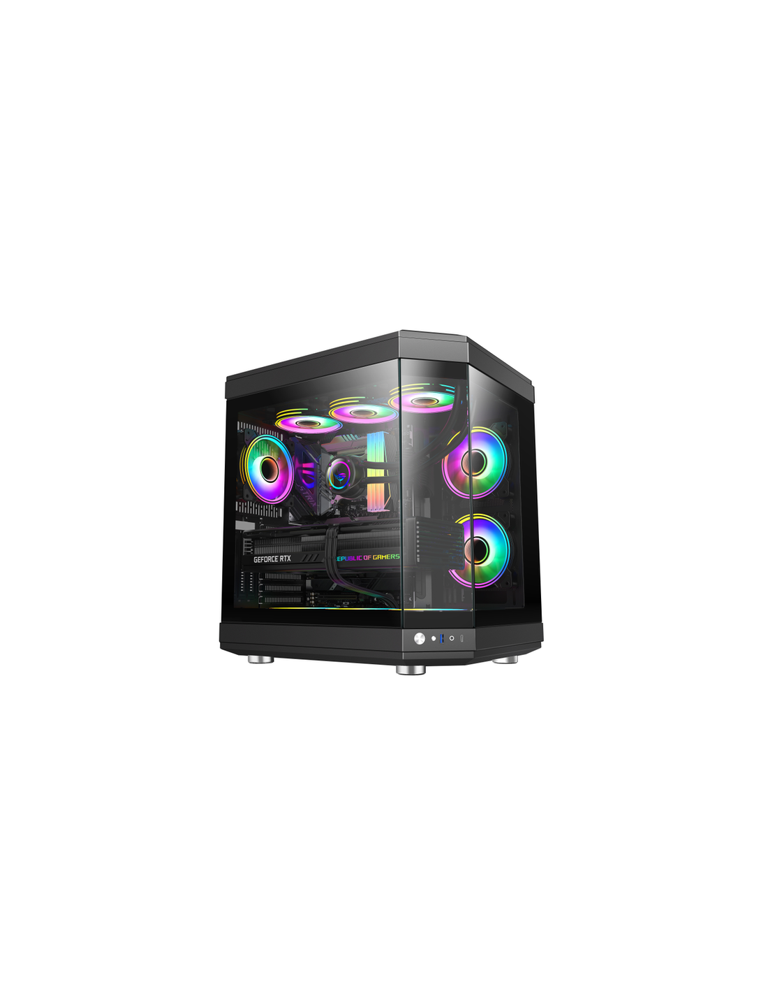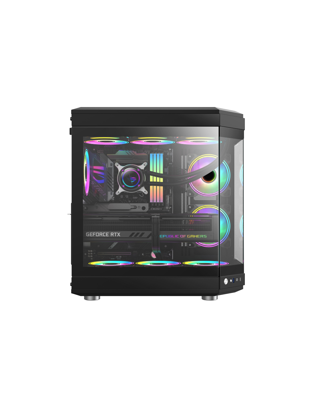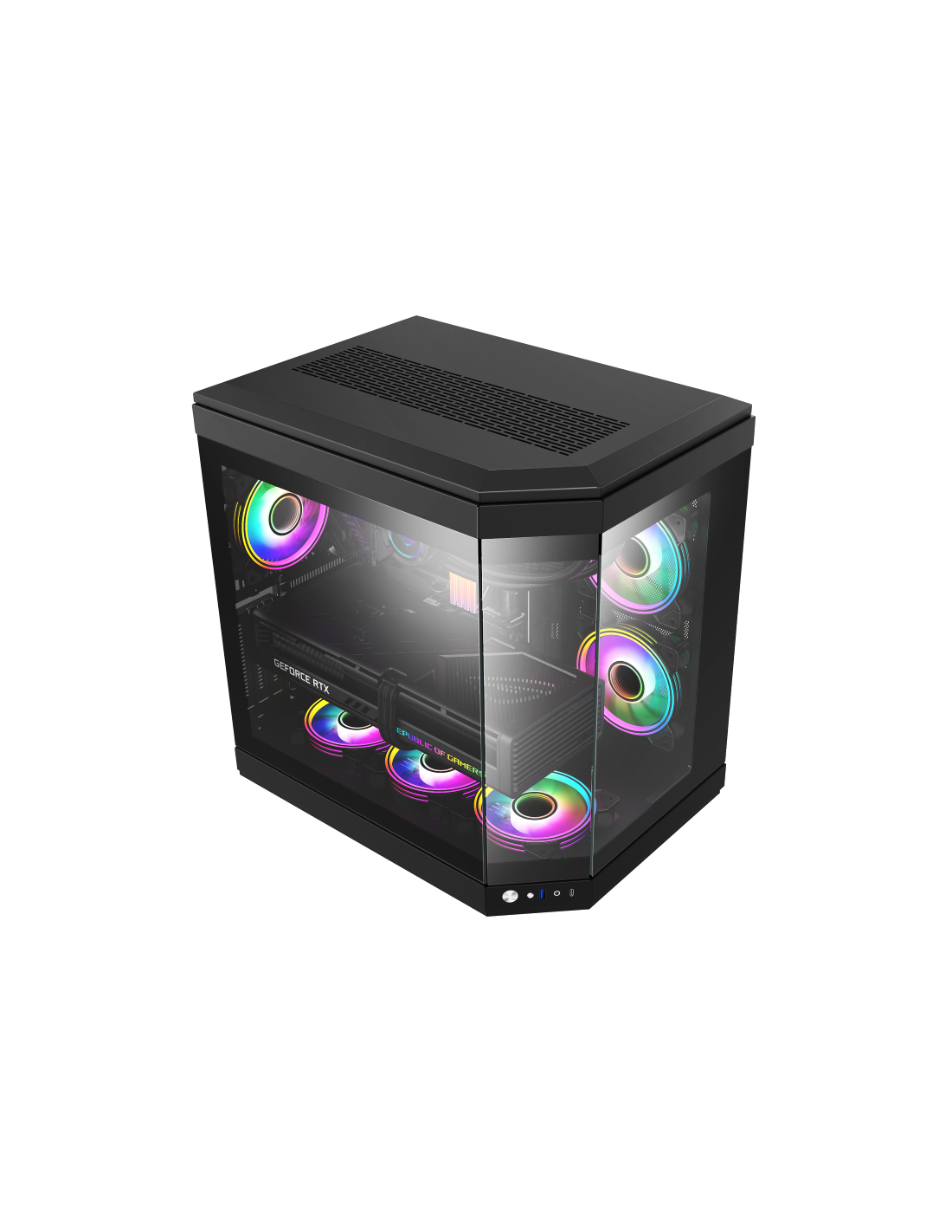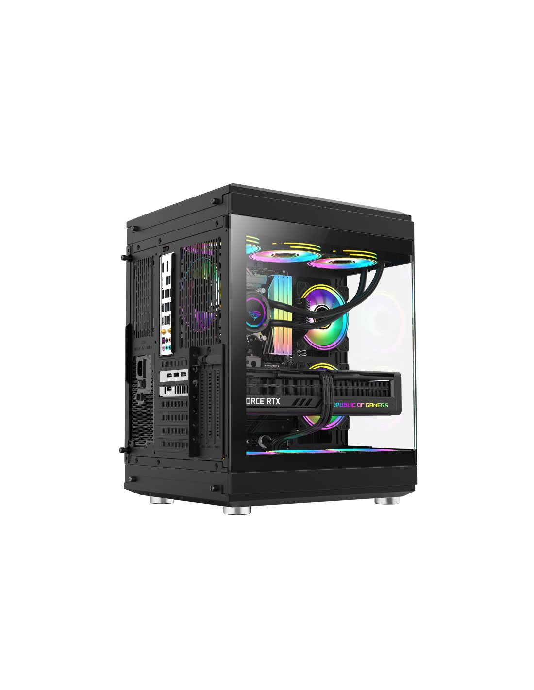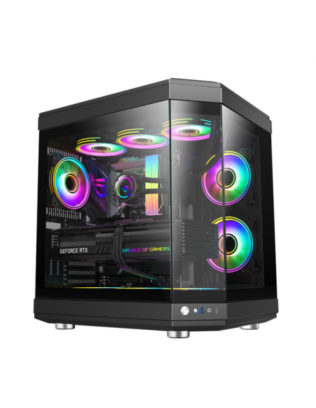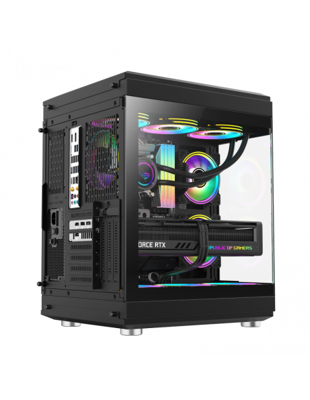 A caixa destaca-se pelo seu design com foco no arrefecimento, integrando três ventoinhas ARGB de 120 mm pré-instaladas, duas localizadas no painel da motherboard e uma na traseira. O painel superior suporta radiadores de até 360 mm, permitindo uma refrigeração líquida avançada. A antecâmara para a fonte de alimentação e os cabos pouco atrativos são escondidos, mantendo o interior limpo e organizado, melhorando o fluxo de ar e a estética. Esta caixa é compatível com as maiores placas gráficas, acomodando placas com até 400 mm de comprimento, e coolers de CPU com até 185 mm de altura.