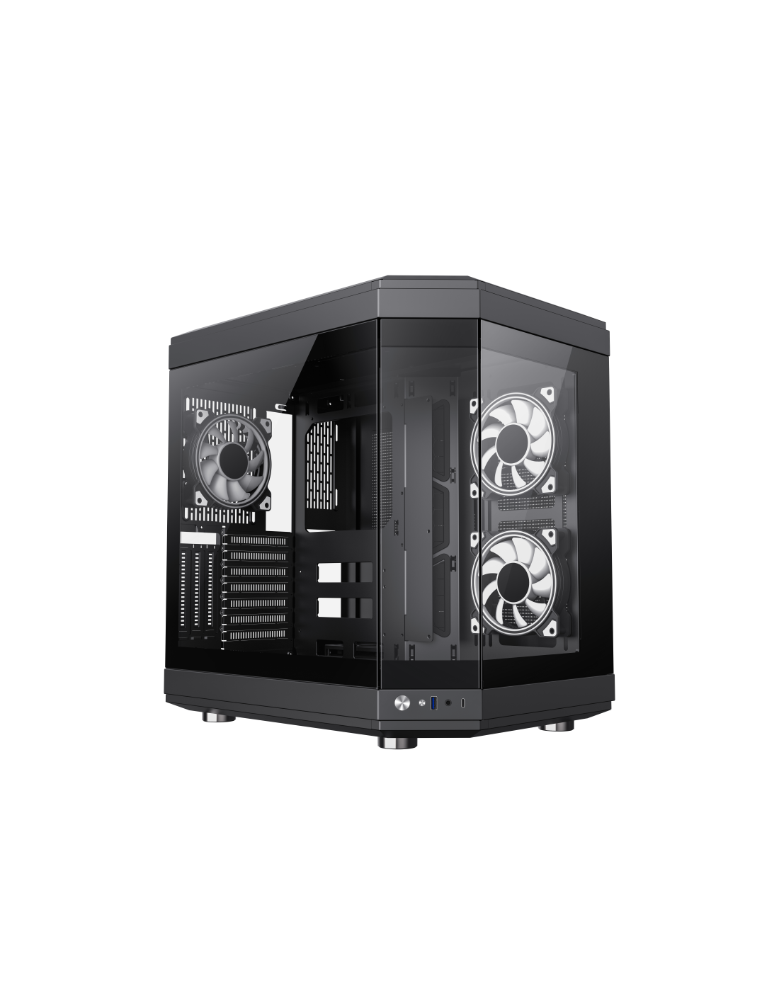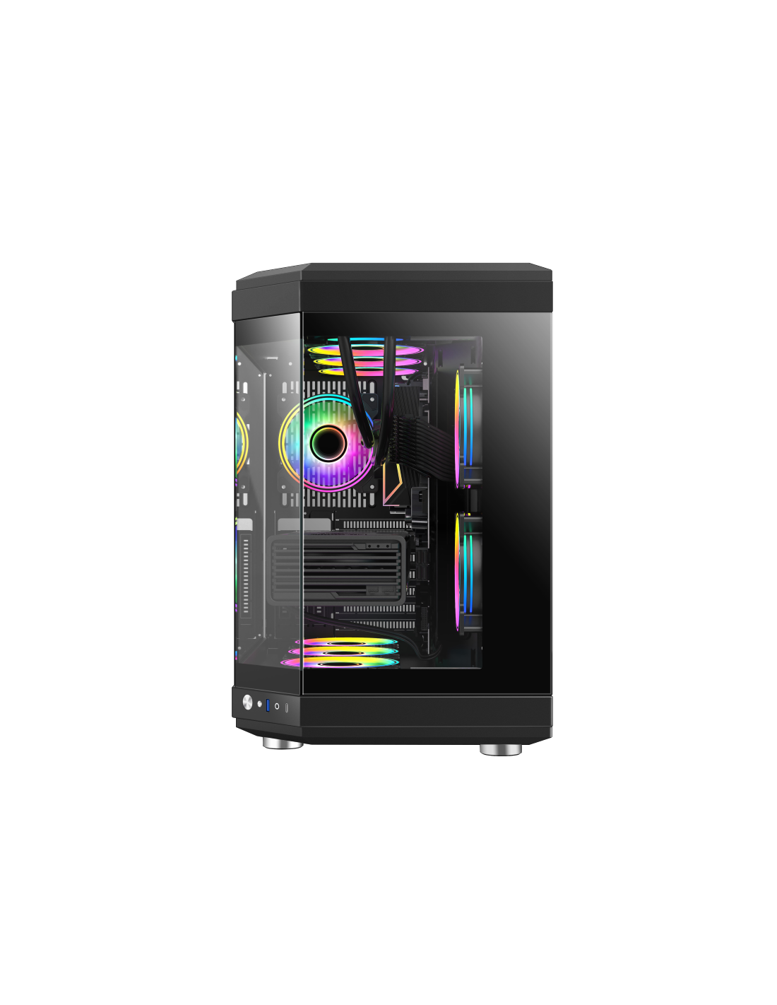 O painel esquerdo é de vidro temperado, permitindo a visualização dos componentes internos. Oferece 2 baías internas de 3.5 polegadas e 2 baías internas de 2.5 polegadas. Não possui baías externas de 5.25 polegadas.