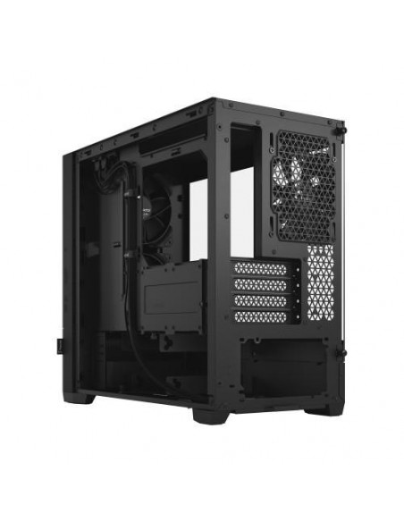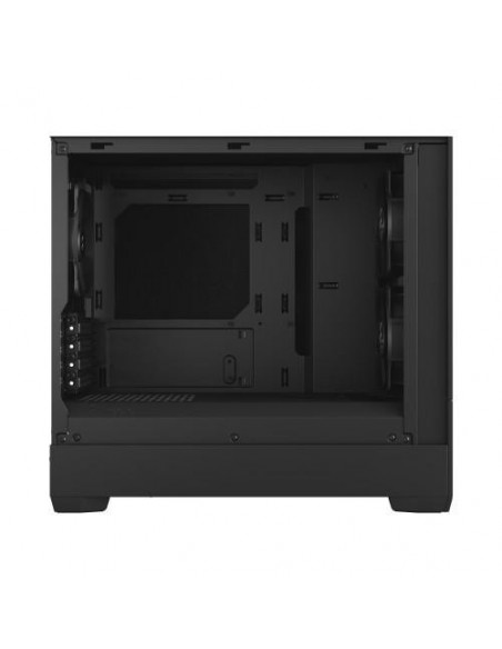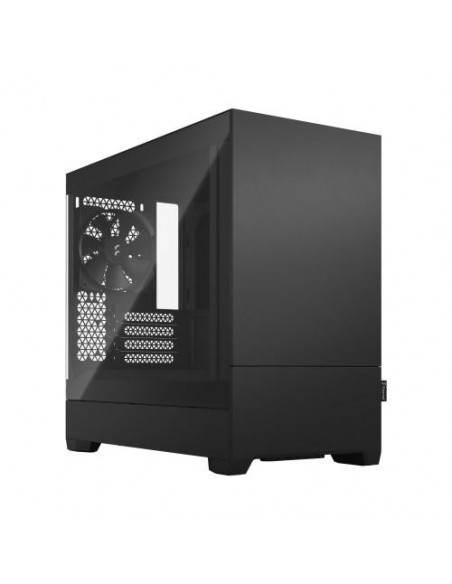 A Fractal Design Pop Mini Silent é uma caixa de computador compacta e silenciosa, perfeita para construções micro-ATX e Mini-ITX.  Construída em aço e vidro temperado, oferece um design elegante e discreto, na cor preta. O painel frontal inclui duas ventoinhas de 120 mm pré-instaladas, garantindo um fluxo de ar adequado para a refrigeração dos componentes.  Há também espaço para mais uma ventoinha traseira de 120 mm e suporte para radiadores frontais de 240 mm e traseiros de 120 mm, dando flexibilidade para a escolha do seu sistema de refrigeração. O design interno foi otimizado para uma gestão de cabos eficiente, com amplo espaço para passagem dos cabos e organização do sistema. A caixa permite a montagem de até quatro discos SSD de 2,5" e dois discos rígidos de 3,5".  Inclui quatro slots de expansão para placas gráficas, com espaço máximo para placas de até 34 cm de comprimento. A fonte de alimentação (ATX) deve ter até 15cm de comprimento. A altura máxima para o cooler do processador é de 17cm. No painel frontal possui 2 portas USB 3.2 Gen 1, e saídas de áudio.  A Fractal Design Pop Mini Silent oferece um equilíbrio perfeito entre desempenho e silêncio, tornando-se uma ótima opção para quem procura um computador eficiente e silencioso. As dimensões da caixa são 215 x 432 x 393 mm (LxPxA), pesando 6,23 kg.  A caixa é entregue numa embalagem de 293 x 517 x 480 mm e com um peso de 7,51 kg.