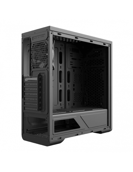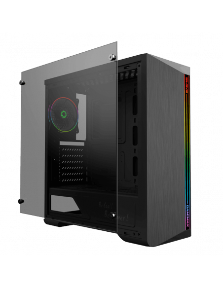 Caixa ATX com painel lateral em vidro temperado, frontal com fita de leds aRGB com botão de controlo de efeitos no topo, uma porta USB 3.2 Gen1 e duas USB 2.0. Inclui ventilador trasiero aRGB 120mm